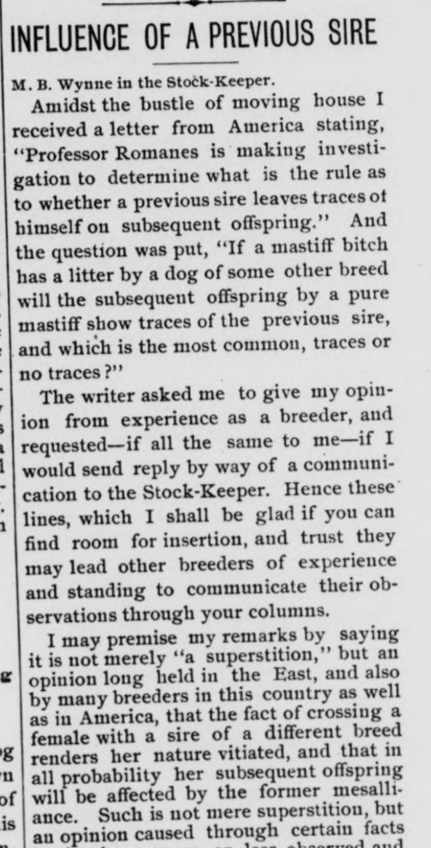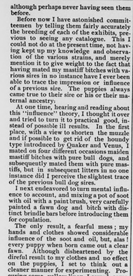 Surprisingly, many scientifically minded individuals argued in favor of the ability of a previous sire to influence future litters. Numerous convoluted ideas were put forth about the mongrel’s sperm being able to go dormant inside the female or being able to partially fertilize an egg which would then go dormant until the female was bred again. We know today that all these beliefs are wrong but it was a hotly debated topic at the time and everyone had an opinion.