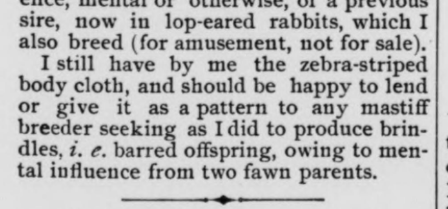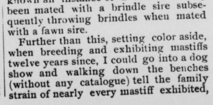 And so we arrive at this article, which offers a rather different view that I thought some here would enjoy. It appeared in The Fanciers’ Journal (March 1892) with a note that it was taken from an English paper, The Stock-Keeper. It was written by a mastiff breeder and includes references to “mental influence” and homemade mastiff pajamas.