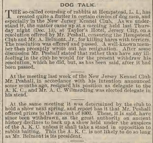 January 24 issue: AKC president and rabbit “courser” August Belmont Jr. gets his doctor friend to write to Forest and Stream to explain it really is a sport and the club is considering numerous “improvements” for next season: