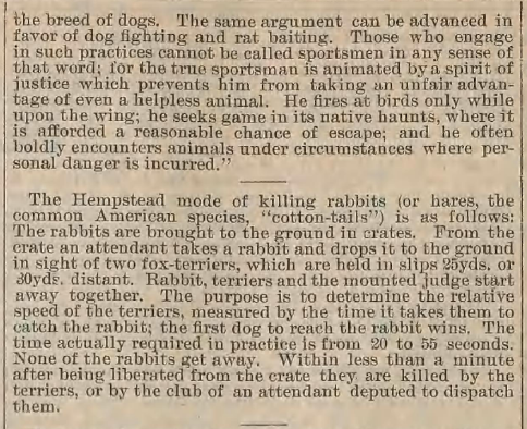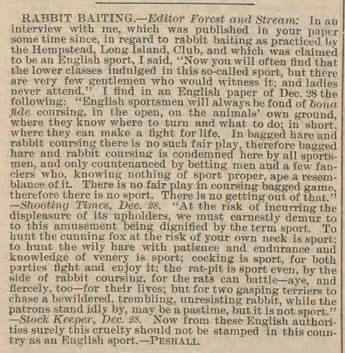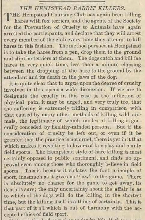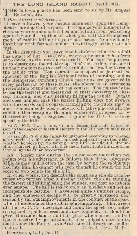 Numerous letters appear in the next couple of issues decrying the Hempstead rabbit “coursing” as cruel and uncivilized.