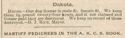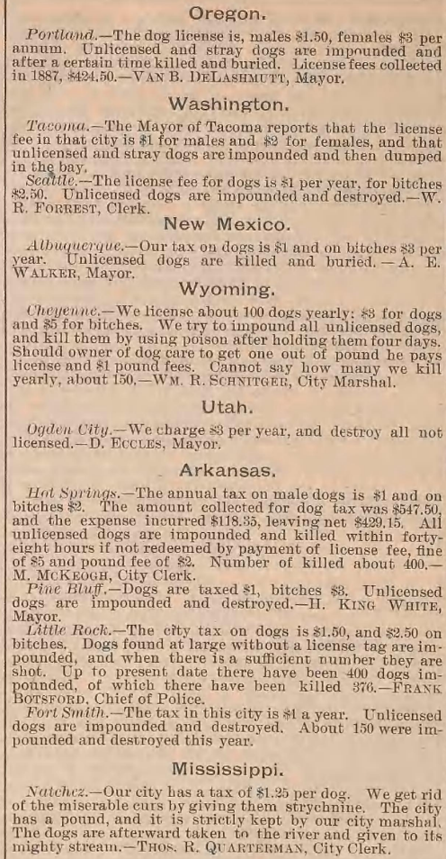 In 1888, the weekly journal Forest and Stream contacted city administrators in a great many states asking whether they had any regulations regarding dogs, how they handled loose dogs, whether they had a pound, who did the killing and what method was used for killing. I’ve included most of the responses below, save one from a mayor in Ohio who included a racial slur in his answer. (If you see something I missed, please let me know so I can burn it.)