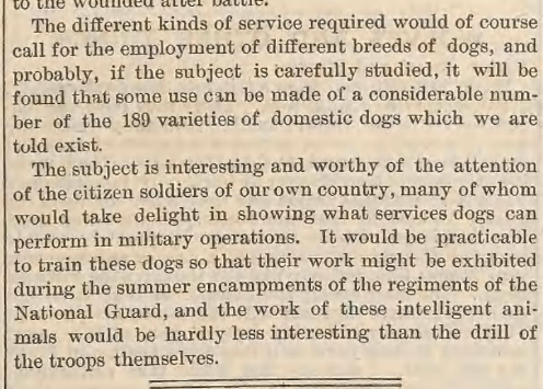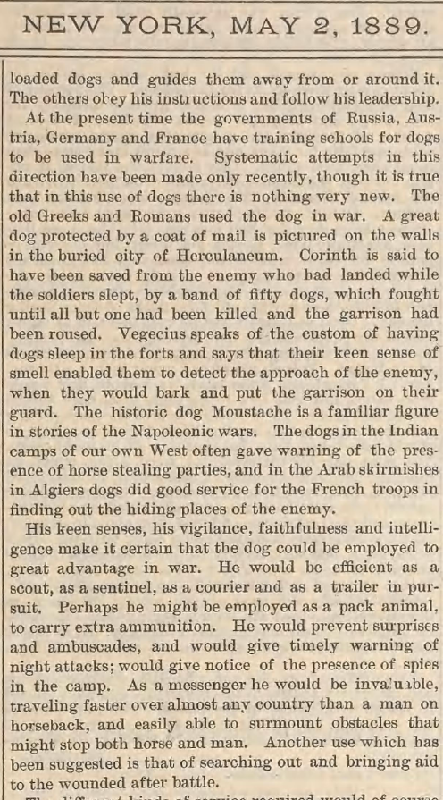 The below article appeared in Forest and Stream, May 2, 1889. I thought it interesting to read the perspective on the history of dogs in war prior to the world wars. Dogs have indeed been trained to work with militaries around the globe since this article was written, including the present day. Dogs are also used as therapy for soldiers who return from war, which this article did not envision.