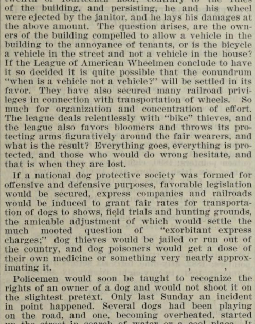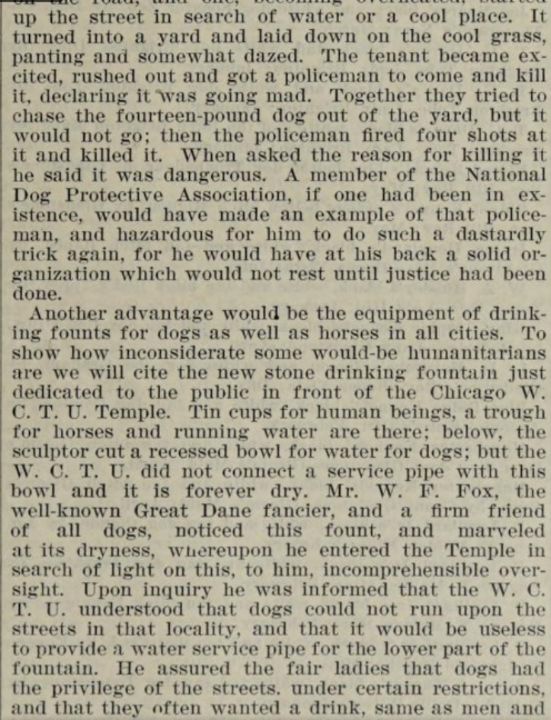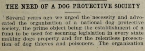 The American Field ran an article (below) in its June 15, 1895 issue on the need for a national organization dedicated to the protection of dogs. Such a society, the piece argues, could prosecute cases of dog killing and advocate for laws which regard the dog as having intrinsic value.