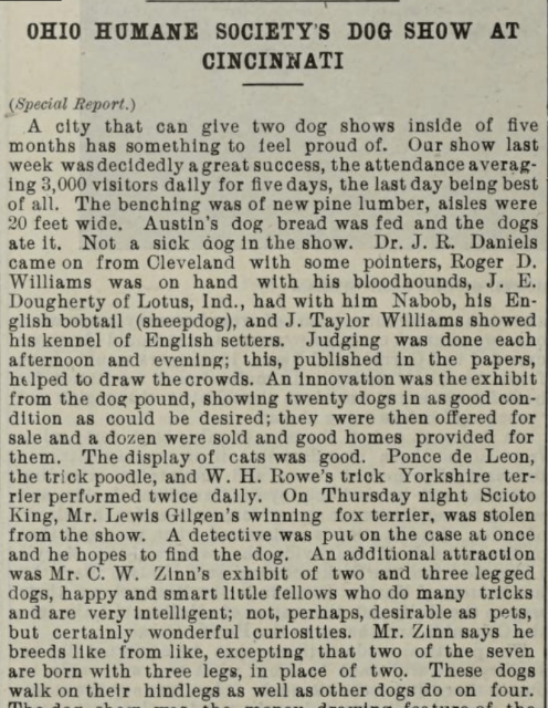 In the spring of 1895, the Ohio Humane Society held a large public event which included a dog show. It was a financial success and the profits were earmarked for a “dog farm” where stray dogs could live instead of being killed. The American Field wrote about the show and here is the relevant portion: