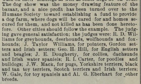 Dog shows and humane societies were looked upon at the time as having a common interest: dogs. They were far from enemies and, as illustrated here, could work together for mutual benefit. It seems impossible to imagine such an event taking place today which, although I am leery of using rose-colored glasses to view history, strikes me as unfortunate.