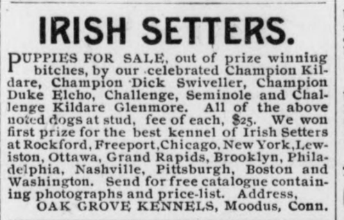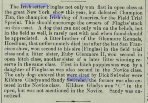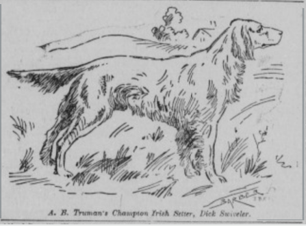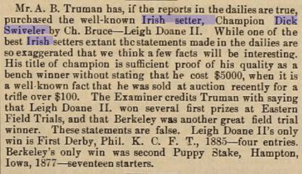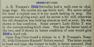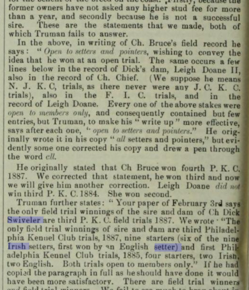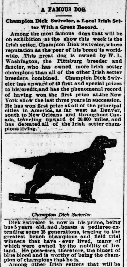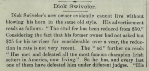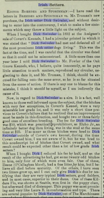 Snippets from the following editorial on Irish Setters appear to cast aspersions on Mr. Covert of Chicago, Mr. Washington of Pittsburgh and Dr. Fowler (see above ad) – all men who owned Dick Swiveler at different times: