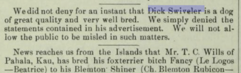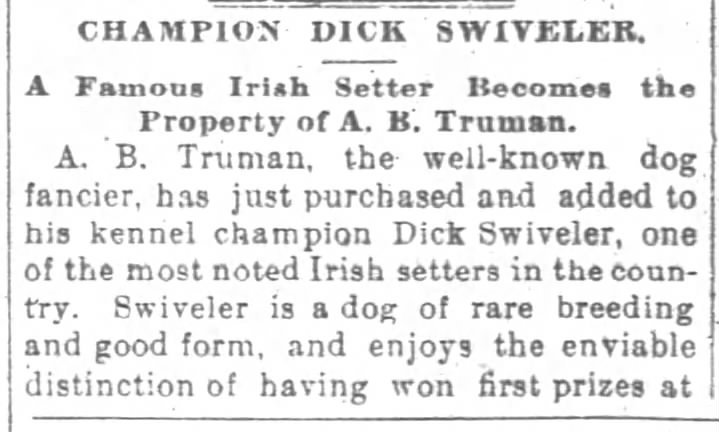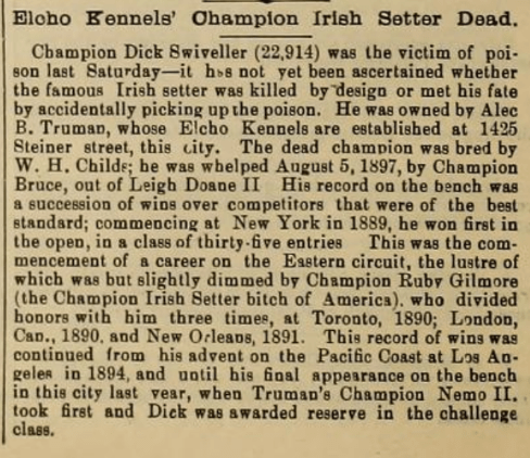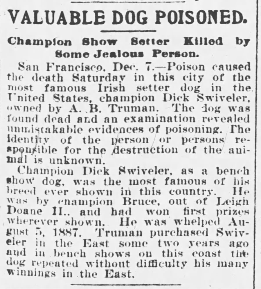 Dick Swiveler was found dead, reportedly poisoned, in his kennel in early December 1898. He was twelve years old. His death was noted on the front page of The New York Times: