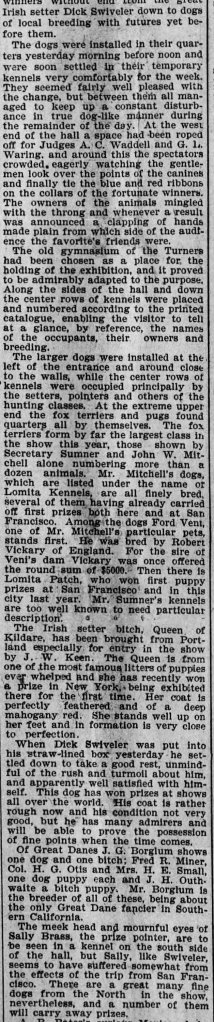 An article on the same show appeared in The Los Angeles Times on April 19, 1894 and provides some flavor of show life from the dogs’ perspective: