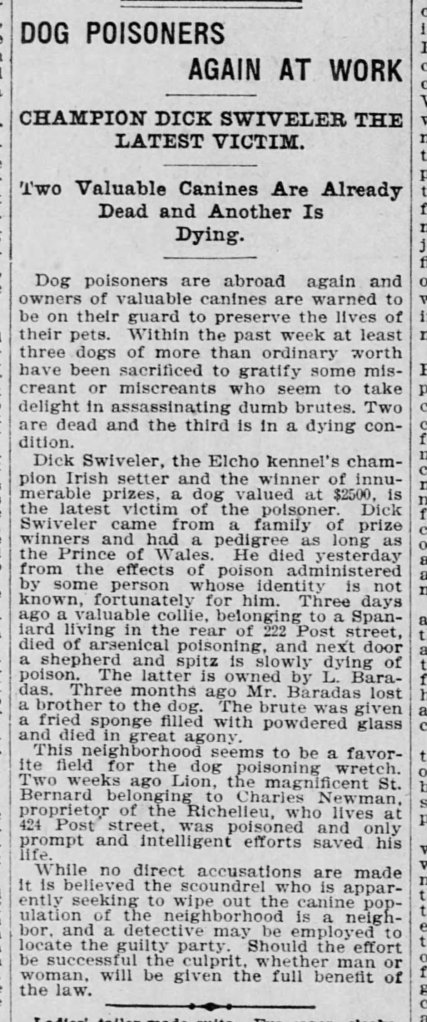 Was Dick Swiveler intentionally poisoned? I don’t believe anyone alive can say. But poisoning was very commonly claimed as a cause of dog deaths during this time. It was often attributed to a nefarious individual, colorfully referred to as “The Poison Fiend” in the weeklies, who purposely fed poison to dogs. It must be noted however that most canine veterinary medicine during this period was DIY and at-home remedies which included ingredients such as mercury, strychnine and other poisons, were regularly printed in the papers and passed along by word of mouth. In addition, dog catchers in some of the cities were tossing poisoned food out to strays on the streets, although the food was supposed to be picked up if not promptly eaten. Opportunities for accidental poisoning certainly existed but my impression is that poisoning was blamed far more often than it actually occurred. Intentional poisoning by a fiend was probably rare. In any case, it was an agonizing way to die.