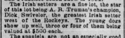 By the end of the year, Dr. Fowler sold Dick to Alexander Bernard Truman of San Francisco. It’s worth noting that each time a dog was sent to a show or sold to a new owner, he was shipped by train. It was by all accounts a miserable way for a dog to travel. Dogs were often reported getting sick after being shipped. A number of dogs died on the train cars from suffocation or neglect (imagine how lost airline luggage fares in modern times). Dick would have spent a considerable amount of his life in a shipping box on a train.