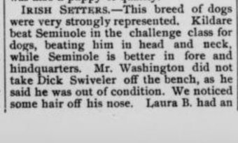 We pick up where we left off in Part One with Mr. Washington having purchased the five year old champion Irish setter Dick Swiveler. The dog was entered in Chicago in February 1892 but not shown:
