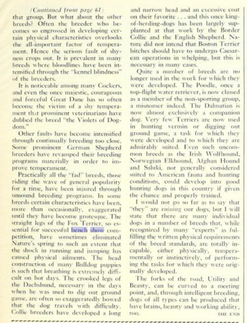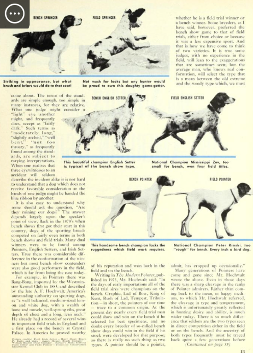 In the May 1953 issue of American Legion Magazine, an article about show type extremes vs. working types in dogs asked a simple question: