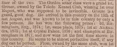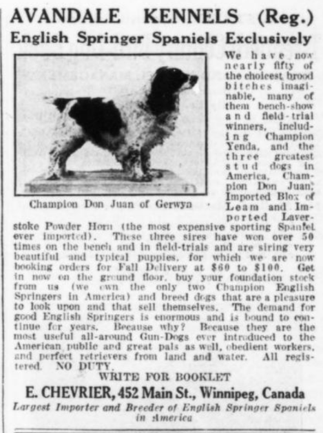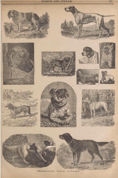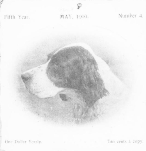 Cocker spaniels in The Dog Fancier, February 1906Forest and Stream, April 3, 1879A sketch of the Gordon setter Grouse in The Chicago Field, February 22, 1879A bit about Grouse from Forest and Stream, January 16, 1879Forest and Stream, August 7, 1879From Field and Stream, May 1900The Dog Fancier, April 1906The Dog Fancier, July 1906The Field Illustrated, October 1915Field and Stream, August 1922A much more spaniel-y looking dog than the springers seen today, pictured in Field and Stream, August 1922.