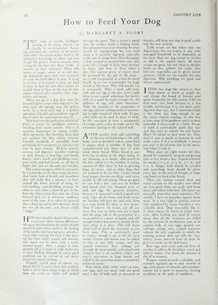 Thank you for sharing this insightful article on dog feeding from Country Life in 1928. It’s fascinating to learn about the importance of careful and intelligent feeding for young animals. The author emphasizes the role of nature in providing perfect food for newborns and highlights the responsibility of pet owners to ensure their pets receive the right nutrients. It’s intriguing to imagine the beautiful glossy coats, clear eyes, and overall health of the dogs at a dog show. Thank you to the author for shedding light on this topic.