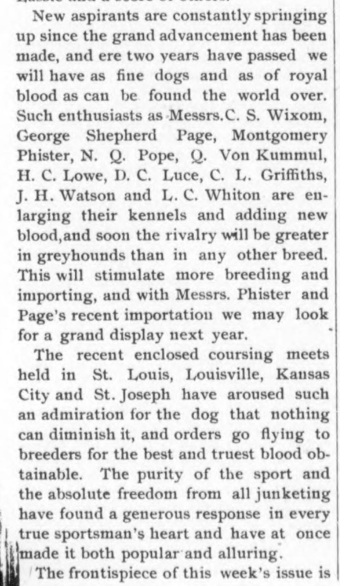 Fullerton, a famous coursing greyhound in England and winner of the Waterloo Cup, pictured in The Fanciers’ Journal, May 31, 1890From the cover of The Fanciers’ Journal, July 12, 1890The Fanciers’ Journal, July 12, 1890The Fanciers’ Journal, November 1, 1890Sketch by H. W. Lacy in Forest and Stream, February 5, 1891Forest and Stream, March 23, 1893Forest and Stream, May 4, 1893The Slipper by G. Denholm Armour in the book British Sport Past and Present by E. D. Cuming, 1909Five images of coursing greyhounds from The Illustrated Sporting and Dramatic News, March 6, 1915