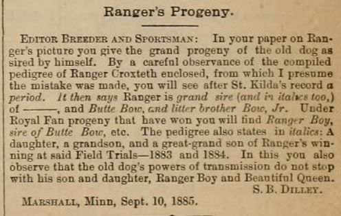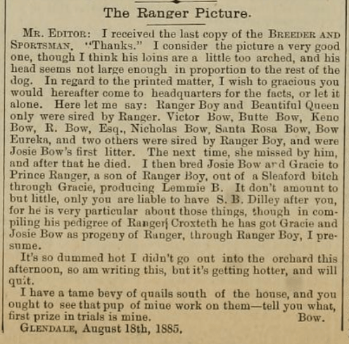 Breeder and Sportsman, August 8, 1885Breeder and Sportsman, August 22, 1885Breeder and Sportsman, September 19, 1885From the book Glover’s Album by veterinarian H. Clay Glover, 1886More like Ripped Rap, amirite? From the cover of The Fanciers’ Journal, August 30, 1890The Fanciers’ Journal, August 30, 1890Forest and Stream, January 12, 1893Forest and Stream, March 16, 1893Forest and Stream, March 23, 1893Forest and Stream, April 20, 1893Forest and Stream, June 29, 1893The Dog Fancier, June 1904Recreation, April 1917Country Life, September 1928The Dog Fancier, January 1908From the classifieds in The Dog Fancier, June 1917