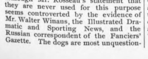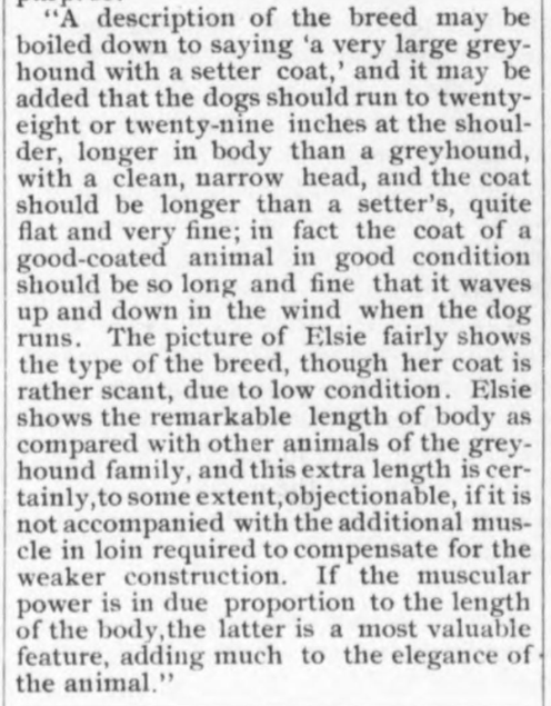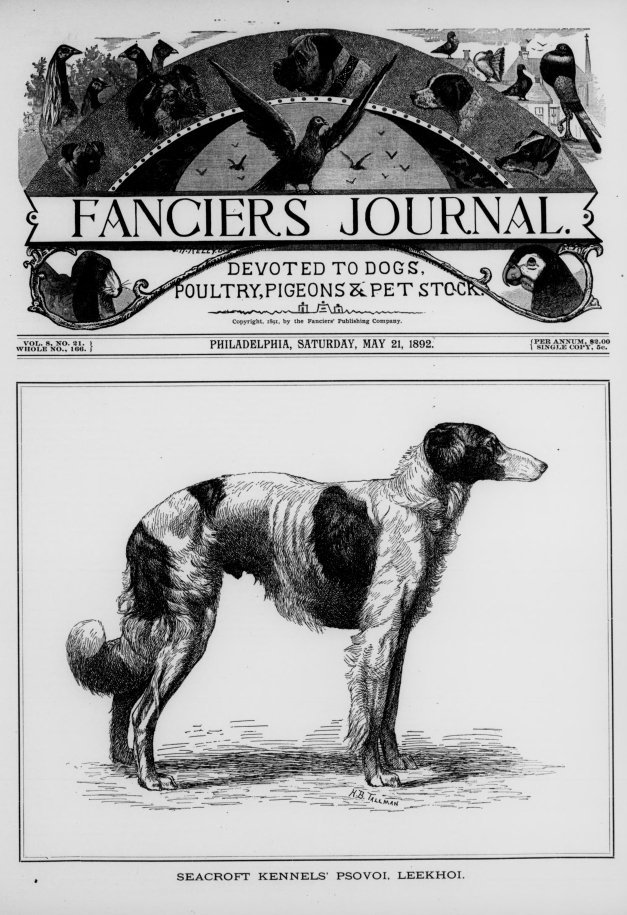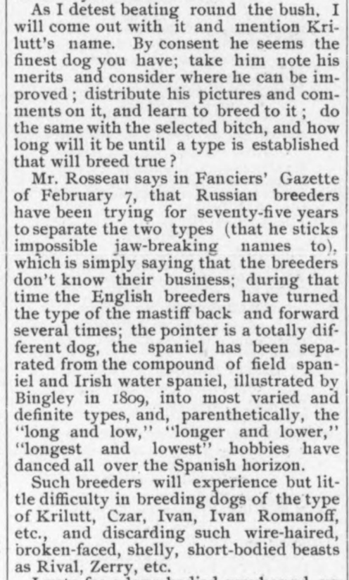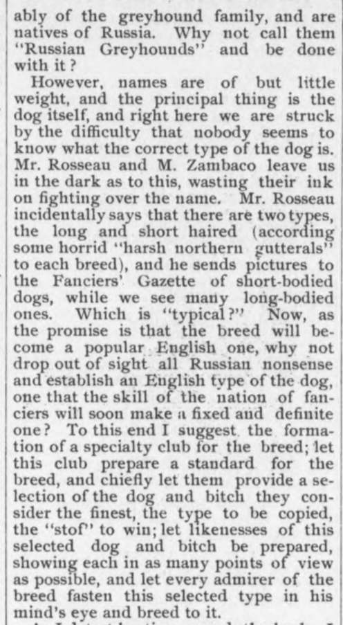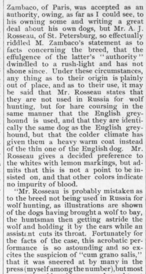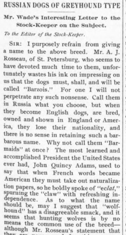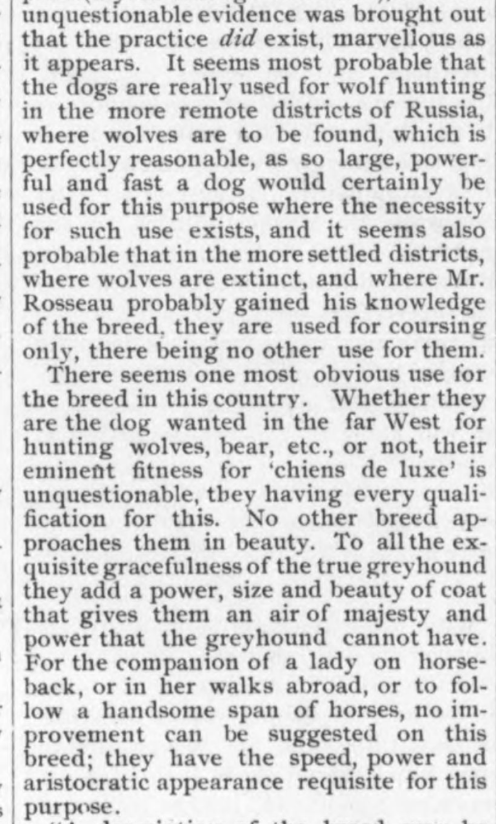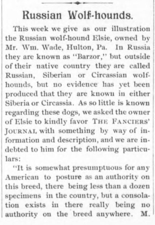 Mr. Wade, author of the above breed description, was generous in offering his many strong opinions on dogs to the kennel papers of the day. Below, he writes more about Russian wolfhounds, a breed still in their infancy in the west. His letter was reprinted in The Fanciers’ Journal, April 26, 1890: