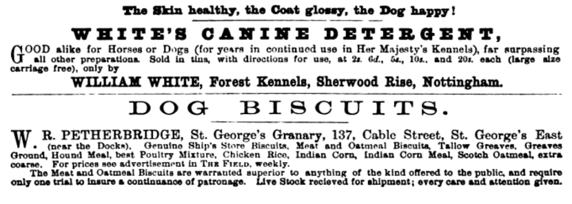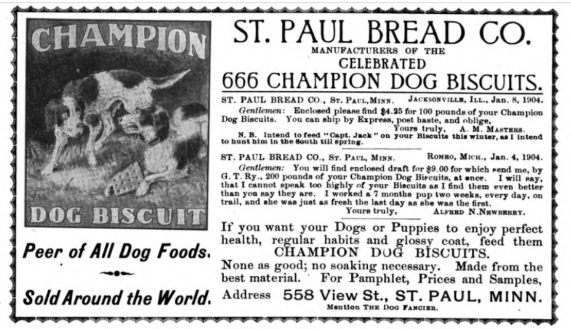 666 biscuits! From The Dog Fancier, May 1904Two ads from the backpages of the book The Dogs of the British Islands by Stonehenge, 1872Breeder and Sportsman, February 6, 1886Breeder and Sportsman, September 25, 1886Forest and Stream, August 5, 1886The Dog Fancier, March 1904The Dog Fancier, January 1907The Dog Fancier, February 1907The Dog Fancier, June 1908The Dog Fancier, June 1908The Dog Fancier, April 1917The Dog Fancier, March 1904Pomeranian ad in The Dog Fancier, June 1908The Dog Fancier, October 1908