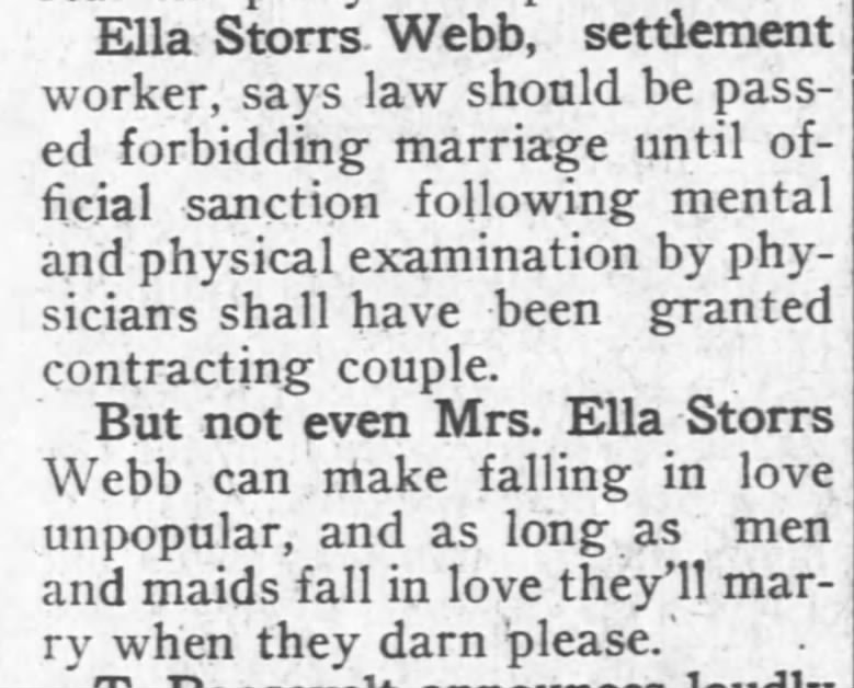 Mrs. Ella Storrs-Webb was part of a reformist movement in the early 20th century and worked in a settlement house. Settlement houses were residences in poor and immigrant areas of large cities, designed to assist those in need, Hull House in Chicago being a famous example. Mrs. Webb occasionally made the news for her outlandish ideas on social reform and editors seemed to enjoy sparring with her in print: