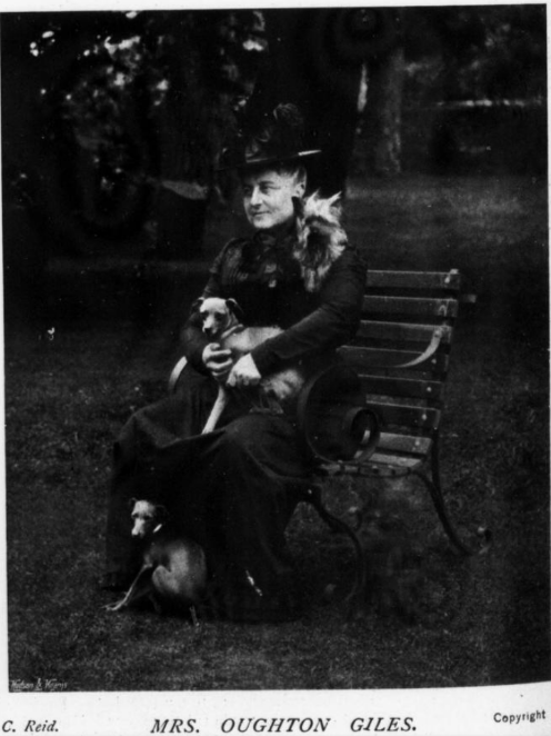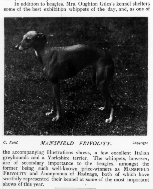 Mrs. Oughton Giles lived in England and was primarily known for beagles but had whippets as well. There is also a Yorkshire terrier in the photograph with her below.