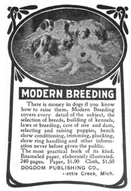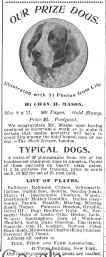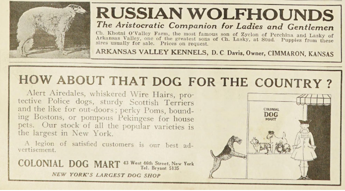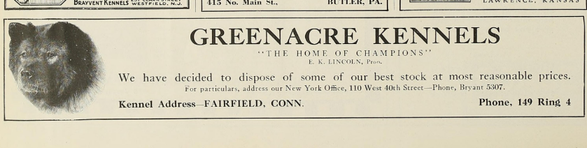 Turf, Field and Farm, July 9, 1897Turf, Field and Farm, July 9, 1897An ad in the back pages of the book: Huntington, H.W. (1897). My dog and I. New York, NY: Caxton PressEnlarged image of the upper left corner of the ad above. Forest and Stream, October 20, 1906Dogdom, June 1911Dogdom, July 1911House and Garden, August 1917House and Garden, September 1917House and Garden, September 1917House and Garden, February 1918Two ads in House and Garden, April 1918House and Garden, May 1918