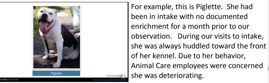 Multnomah County Animal Services in Oregon has a long and troubled history. A county audit in 2016 found that records were severely lacking, including intake and outcome information on thousands of animals and the use of euthanasia drugs. Other serious problems included insufficient staff to properly feed, clean and exercise animals, staff not trained to provide essential animal care, adopters not being advised of an animal’s bite history, housing prey animals such as birds and rabbits within sight of cats, turning away pets despite being an open admission facility and having space available, leaving dogs and cats in intake for weeks without social enrichment or exercise, and astonishingly, the absence of a daily rounds program. In 2018, a follow up audit found that most of these issues had been addressed only partially or not at all.
