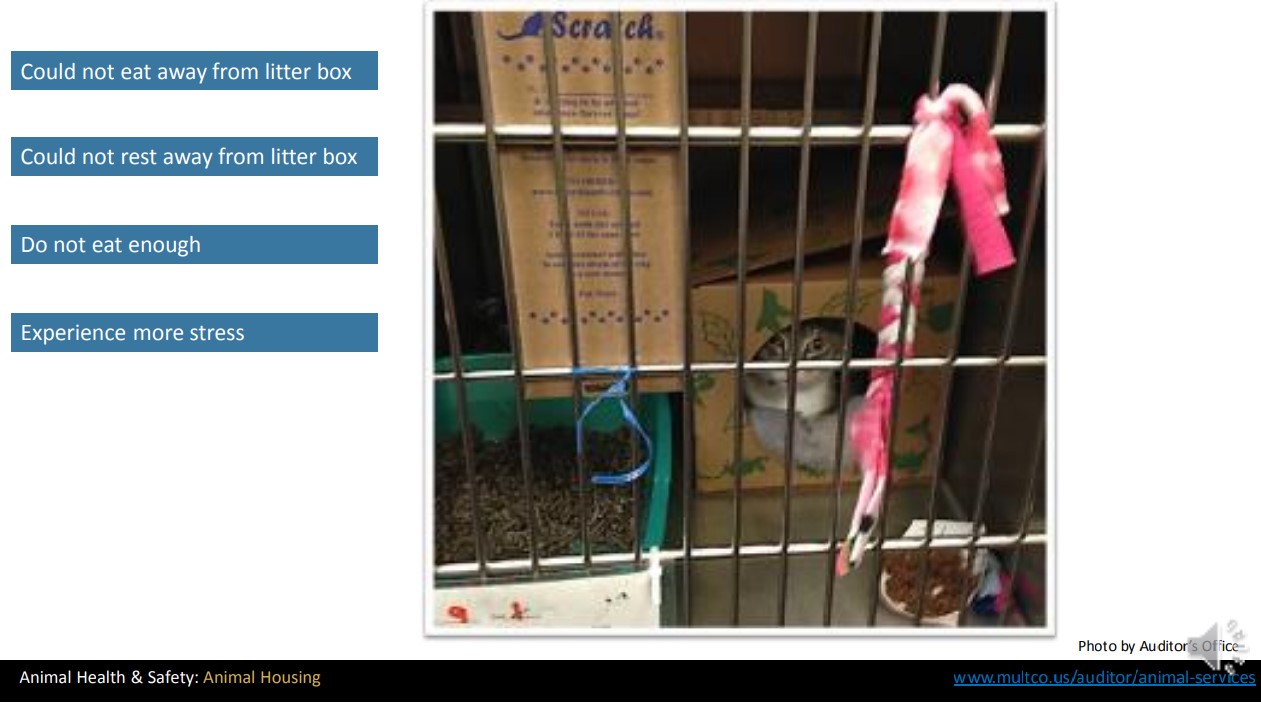 Multnomah County Animal Services in Oregon has a long and troubled history. A county audit in 2016 found that records were severely lacking, including intake and outcome information on thousands of animals and the use of euthanasia drugs. Other serious problems included insufficient staff to properly feed, clean and exercise animals, staff not trained to provide essential animal care, adopters not being advised of an animal’s bite history, housing prey animals such as birds and rabbits within sight of cats, turning away pets despite being an open admission facility and having space available, leaving dogs and cats in intake for weeks without social enrichment or exercise, and astonishingly, the absence of a daily rounds program. In 2018, a follow up audit found that most of these issues had been addressed only partially or not at all.