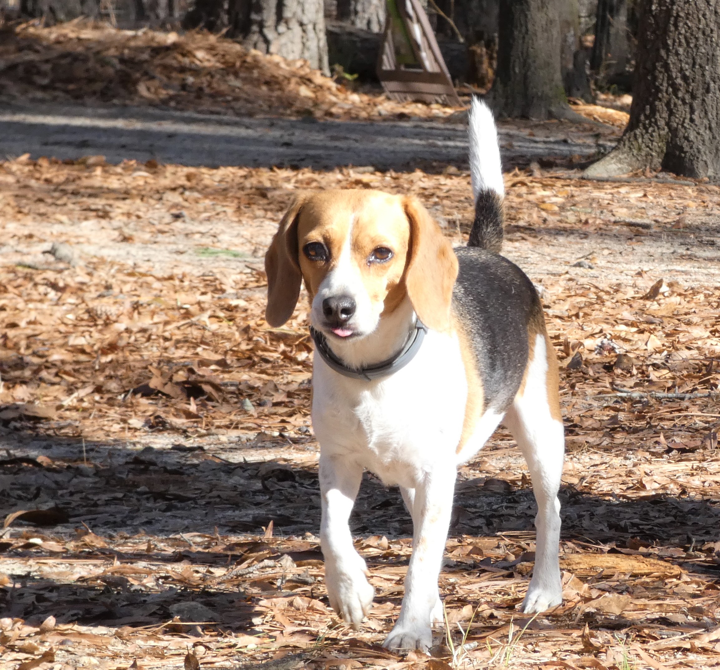 Full body image of beagle outside, trotting toward camera with her tongue tip visible.