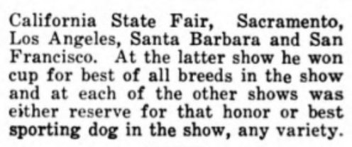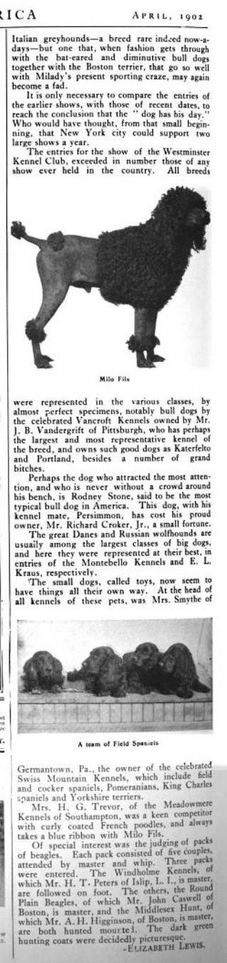 Often referred to around the turn of the century simply as “the New York show”, the annual Westminster Kennel Club dog show was a big deal then, as it is today. The article snippets, sketches/photos and ads below will, I hope, convey a sense of how significant bragging rights were to the owners of dogs earning ribbons (and not just first place ribbons) at the show.