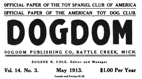 Shields, G.O. (1891). The American book of the dog. Chicago, Illinois: Rand, McNally & CompanyMastiffs in Forest and Stream, August 4, 1894Sewell, A.J. (1907). The dog’s medical dictionary. London, England: George Routledge & Sons, LimitedLytton, J. (1911). Toy dogs and their ancestors. New York, New York: D. Appleton and CompanyLytton, J. (1911). Toy dogs and their ancestors. New York, New York: D. Appleton and CompanyDogdom, March 1913Dogdom, March 1913Dogdom, May 1913Dogdom, June 1913Anon. (April 1918). The dog of the hour. House and Garden, p. 86Dogdom magazine reported the death of its editor and manager Eugene R. Cole in its May 1913 issue with two pages (below). Dogdom, May 1913Two ads from the classifieds at the end of Forest and Stream, April 8, 1886