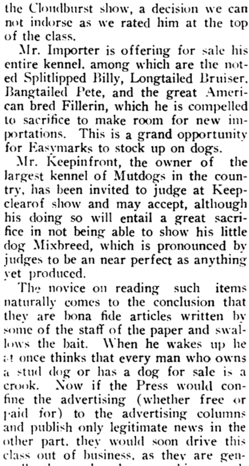 Lastly, a rather on point article on the dog show game, sadly relevant in any era.