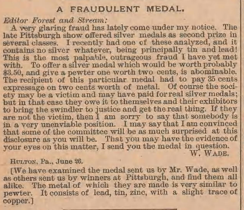Mr. Wade, a regular rabble-rouser in the press, allegedly had a dog show prize “analyzed” and found it lacking: