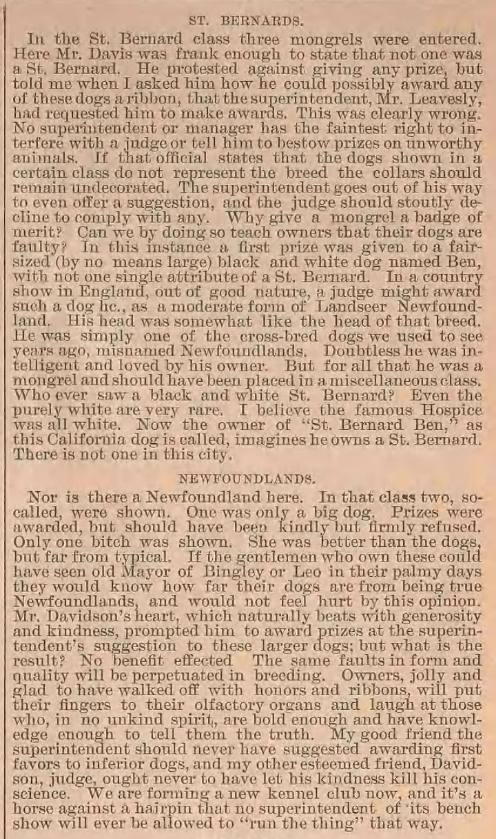 The San Francisco dog show of August 1886 had precious few quality entries in the eyes of the correspondent for Forest and Stream. A few snippets from his remarks: