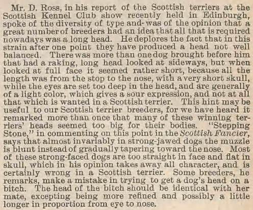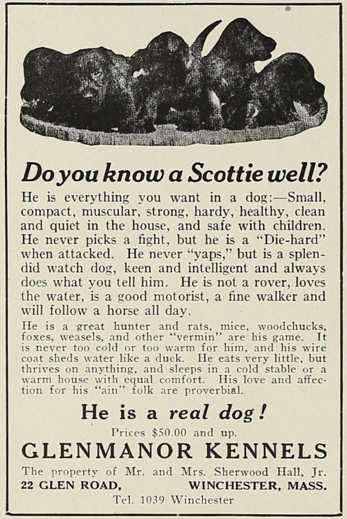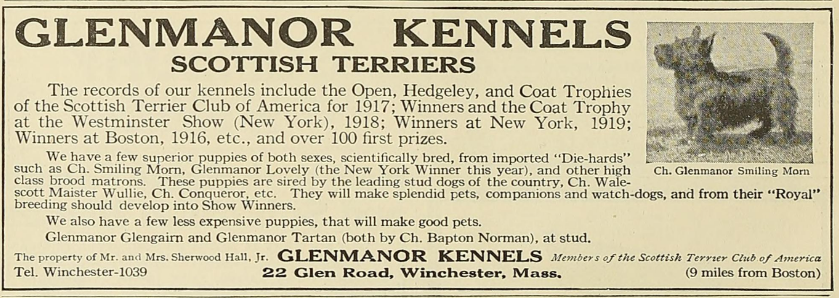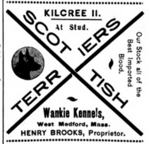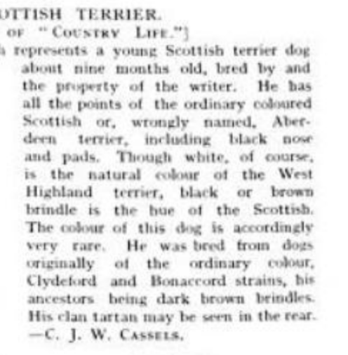 Bingley, W. (1877). The animal kingdom. Philadelphia, Pennsylvania: Hubbard BrosShields, G.O. (1891). The American book of the dog. Chicago, Illinois: Rand, McNally & CompanyJames, G.B., Jr. (1894). The dog and how to breed, train and keep him. Boston, Massachusetts: Walnut Publishing CoFrom an ad in the book: James, G.B., Jr. (1894). The dog and how to breed, train and keep him. Boston, Massachusetts: Walnut Publishing CoFrom Forest and Stream, December 22, 1894Four of the images used to represent the breed in the book: Huntington, H.W. (1901). The show dog. Providence, RI: Remington Printing CoThis photo was published on page 376 of Country Life, September 10, 1910. It was accompanied by a paragraph titled A White Scottish Terrier and began: “Sir, The accompanying photograph represents…” (continues below)Dogdom, April 1913Haynes, W. (1915). Effect of the popular sire. Journal of Heredity, VI(11), 494-496Turf, Field and Farm, July 9, 1897House and Garden, July 1919House and Garden, January 1920