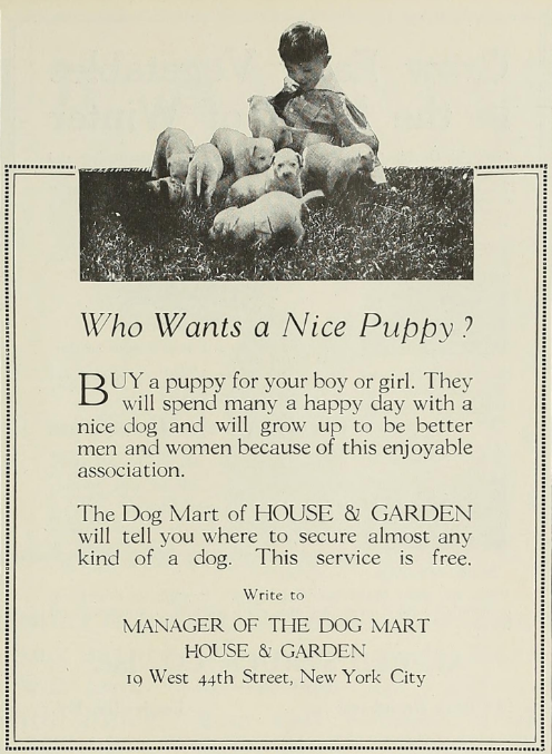 Cover of Dogdom, March 1909Dogdom, April 1909Dogdom, October 1909The first kid’s haircut is killing me. I like the discreet photobomb in the second pic. From Dogdom, December 1909Dogdom, January 1910Cover of Dogdom, February 1910Skinner, F.J. (Ed.). (1910). Breeders’ and exhibitors’ of dogs guidebook and directory (2nd annual volume). New York, NY: The Bulletin CompanyDogdom, February 1912Dogdom, March 1913Cover of The Dog Fancier, June 1913Dogdom, July 1913House and Garden, September 1919House and Garden, November 1919