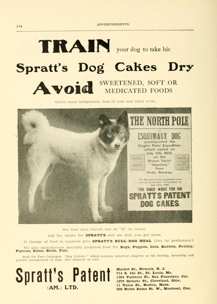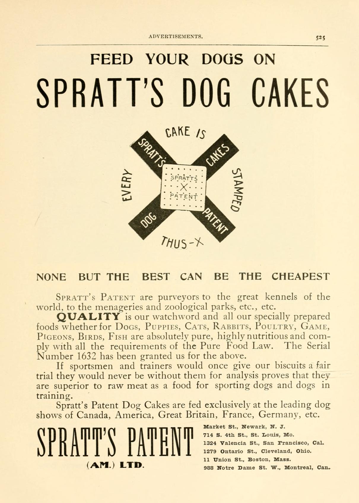 Citation: Land and Water. (1887, January 15). Spratt’s dog biscuits. Breeder and Sportsman, p. 44A full page ad claiming that Spratt’s was producing 500 tons of animal food per week, from the book: Plageman, R. B. (1899). House dogs, their care and treatment. New York: S. C. HodgeThis ad specifically targets greyhound owners with a special food for the breed. From The Fanciers’ Journal, May 6, 1893Full page ad in The Sportsman’s Directory compiled by Will Wildwood, 1891Ad containing typos in The Fanciers’ Journal, April 29, 1893From the backpages of the book: James, G.B., Jr. (1894). The dog and how to breed, train and keep him. Boston, Massachusetts: Walnut Publishing CoSpratt’s was hired to bench and feed the dogs at many shows. This ad appeared in: Second annual bench show of dogs, official catalogue. Butterfly Bench Show Association, Lockerby Hall, Grand Rapids, Michigan, 1896.Turf, Field and Farm, July 16, 1897A Spratt’s ad in The Pall Mall Gazette (London, England) · January 5, 1898Spratts is not going to be your dog importer whipping boy anymore. From Turf, Field and Farm, December 29, 1899From the back pages of the book: Huntington, H.W. (1901). The show dog. Providence, RI: Remington Printing CoR.H. Moore illustration for an ad showing benched dogs being fed Spratt’s. The company was in charge of feeding at many dog shows of the era. From the book Dog Shows and Doggy People by Charles Henry Lane, 1902From the backpages of the book British Dogs (Third Edition) by W. D. Drury, 1903Forest and Stream, July 7, 1906An ad in the back pages of the book: Croxton, A. C. (1906). British dogs at work. London, England: Adam and Charles Black