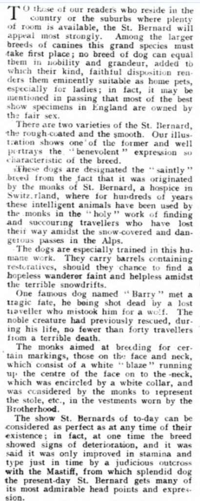 This series of articles, entitled “Dogs Worth Keeping” appeared in The Country-Side in 1908-1909 and, though lacking a byline, was presumably the work of the magazine’s editor, E. Kay Robinson. Following are excerpts from articles on the fox terrier, the Irish terrier, the St. Bernard and the great Dane.