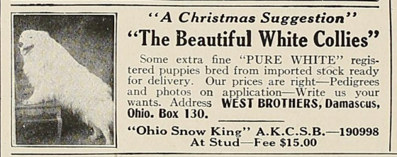 I wonder if “Ye Olde Dog Kennels” was an early puppy farm, or if they were a broker? Interesting that white collies seem to be more visible then. Now, they are barely known.