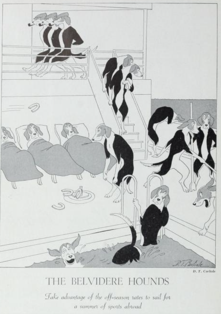 The Devon and Somerset staghounds in Country Life Illustrated, January 8, 1897Two photos of the Essex hounds in Country Life Illustrated, February 6, 1897Two images of the Warwickshire hounds from Country Life, January 23, 1904Anon. (1904, July 30). Draghound races. Country Life, pp. 178-179The Warwickshire hounds (sixty-two and a half couples) again, this time on an exercise break, having run 14 miles with the huntsman. Country Life, August 27, 1904Source for two images above: X. (1904, November 12). Lord Middleton’s hounds. Country Life, pp. 716-718A cute cartoon by D. T. Carlisle depicting a pack of foxhounds on a cruise ship in Country Life & the Sportsman, May 1938Country Life & the Sportsman, October 1938Country Life & the Sportsman, April 1939A whiskey ad in House Beautiful, August 1934