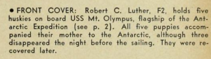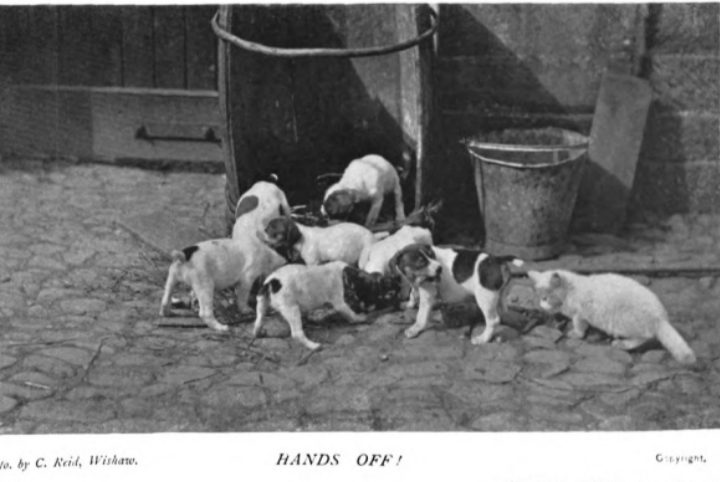 Fox terriers having a meal and fending off an interested party from outside the family. Country Life Illustrated, January 23, 1897Caniculus. (1903, March 7). Mrs. Kilburn Scott’s Samoyeds, Country Life, pp. 300-302Country Life, December 5, 1903Country Life, December 19, 1903The Country-Side, March 27, 1909Well! Source: Williams, L. (1919). A manual of toy dogs (3rd ed.). London: Edward ArnoldCountry Life & the Sportsman, September 1938This U.S. Navy publication from January 1947 indicates there are five sled dog pups in the photo although I only see four.