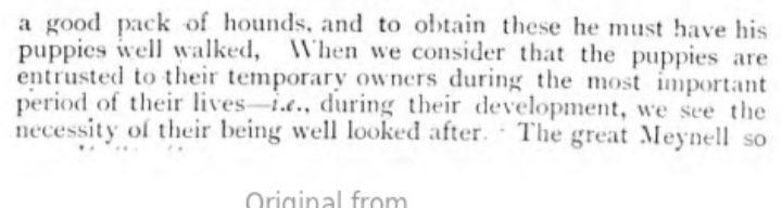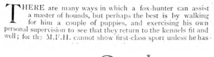 Hound puppies born into working packs in England were “walked,” that is, sent to live with residents of the community after weaning then returned in the spring. Raising hound pups for most of their first year was a service provided by the locals who saw the packs as beneficial to the community. It provided puppies with the individual attention needed and was thought to allow them a better chance of surviving distemper. The article below, printed in the February 13, 1897 issue of Country Life Illustrated, references foxhounds but beagles were often walked as well.