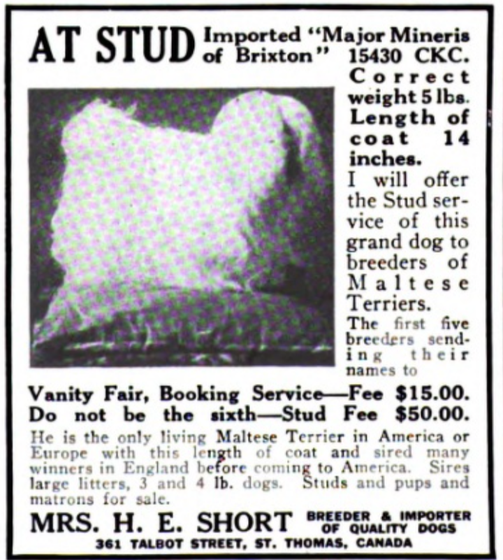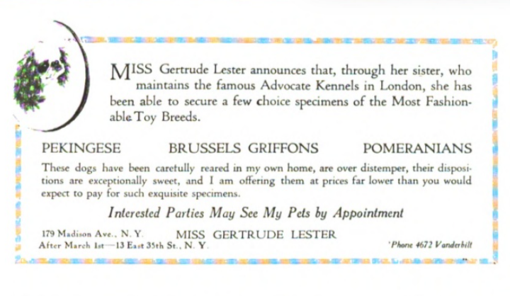 Country Life Illustrated, January 23, 1897The Breeder and Sportsman, December 13, 1902Country-side, May 1913Why not? Vanity Fair, August 1916Vanity Fair, January 1917Vanity Fair, February 1917Vanity Fair, February 1917Vanity Fair, March 1917Vanity Fair, March 1917Vanity Fair, May 1917Vanity Fair, May 1917Source: Williams, L. (1919). A manual of toy dogs (3rd ed.). London: Edward ArnoldVanity Fair, July 1916Vanity Fair, August 1916Vanity Fair, September 1916Vanity Fair, December 1916Vanity Fair, February 1917Vanity Fair, March 1917Two ads and one unnecessary apostrophe. Source: Eberhart, Alvin George. (1917). Everything about dogs. Pub. for the Eberhart kennels, Camp Denison, O., by the Field and Fancy Pub. Corp.