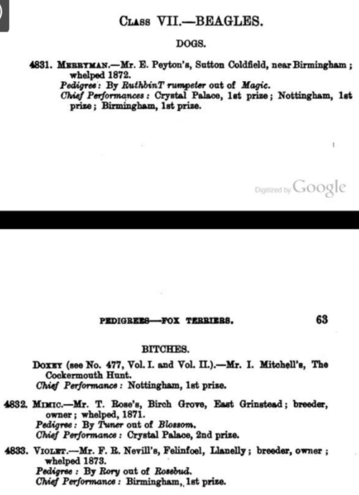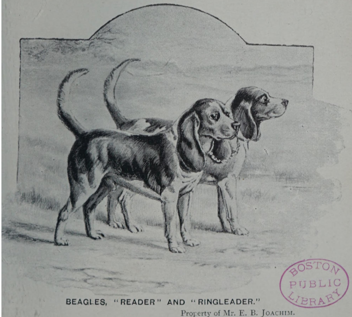 Just four beagles listed in The Kennel Club Calendar and Stud Book – Vol III, 1876 (ignore the fox terriers page heading, fox terriers were listed directly after beagles and took up most of the page)Source: Stables, G. (c. 1890s). Our friend the dog. New York: Frederick A. Stokes CompanyCountry Life Illustrated, March 6, 1897Country Life Illustrated, March 27, 1897Two photos of the Eton College beagles in Country Life Illustrated, April 24, 1897Two images from: Biggle, J. (1900). Biggle pet book. Philadelphia: W. AtkinsonPack at the Ladies Kennel Association show Image from Vanity Fair, August 1916Vanity Fair, February 1917Source: Hochwalt, A. F. (1922). Dogs as home companions. Cincinnati: Sportsman’s DigestCh. Meadowlark Draftsman owned by Mrs. William du Pont Jr., in Country Life and the Sportsman, February 1939An ad in the poultry and pigeon publication The American Fancier, June 8, 1901
