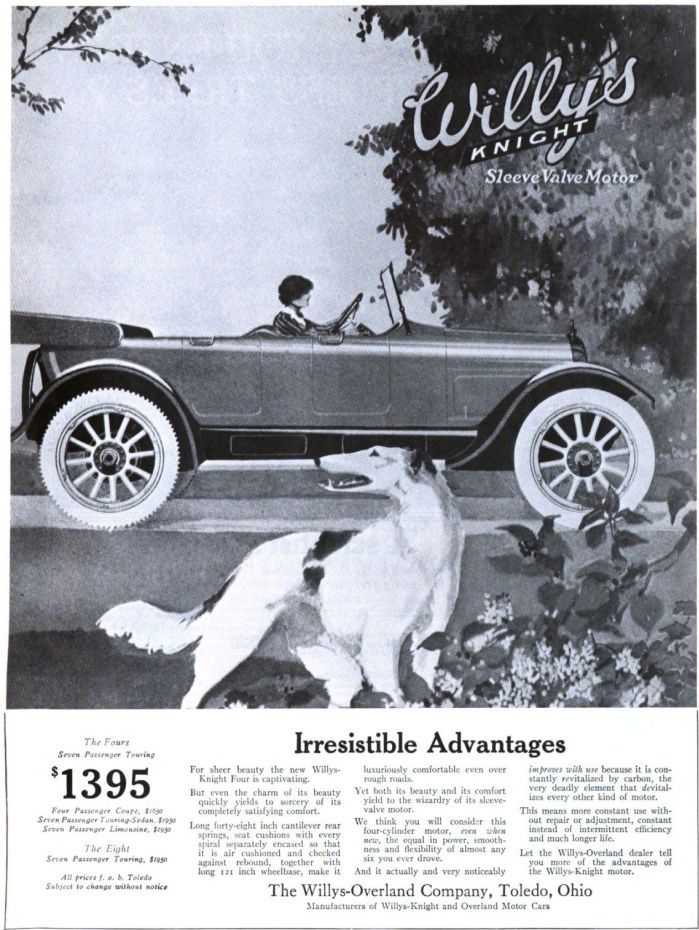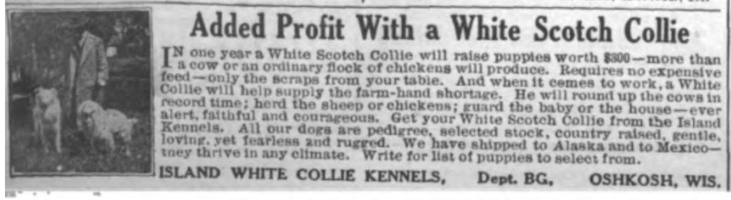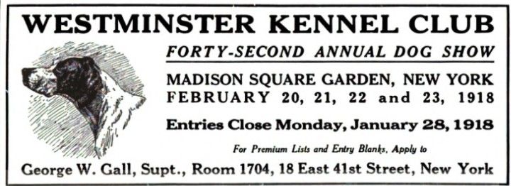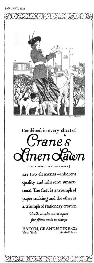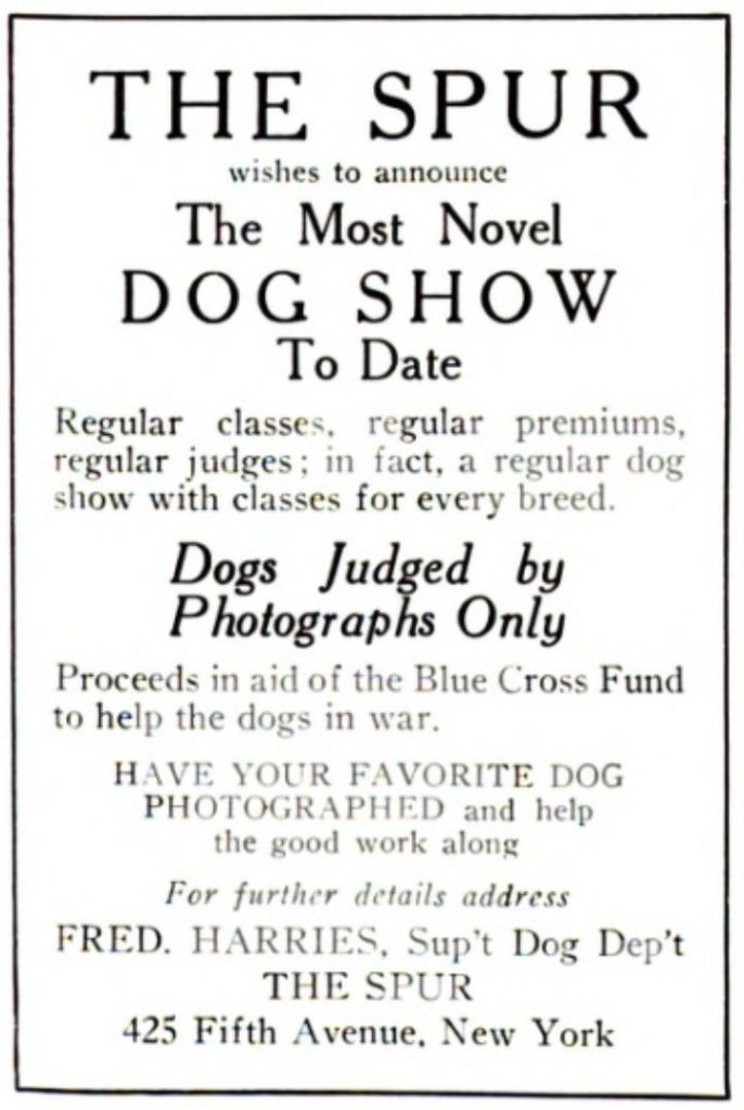 Vanity Fair, June 1917A full page car ad featuring a woman driving and a stylish borzoi in Vanity Fair, June 1917Fear of typhoid fever was behind this ad for a screened pen on wheels designed to hold babies. A devoted terrier is depicted standing guard nearby. Source: Vanity Fair, July 1917Vanity Fair, July 1917A Pomeranian with a large bow is depicted in this skincare ad which includes the lovely phrase “the veriest whisper of disappointment” in the text. Vanity Fair, October 1917A brace of Boston terriers in this car ad in Vanity Fair, November 1917Borzoi depicted lying at the feet of a Russian woman in this perfume ad in Vanity Fair, December 1917It was novel, I’ll grant them that. Vanity Fair, December 1917Fox terrier in a shoe polish ad Vanity Fair, December 1917Bulldog and borzoi in a stationery ad in Vanity Fair, January 1918Vanity Fair, February 1918The Breeder’s Gazette, August 8, 1918