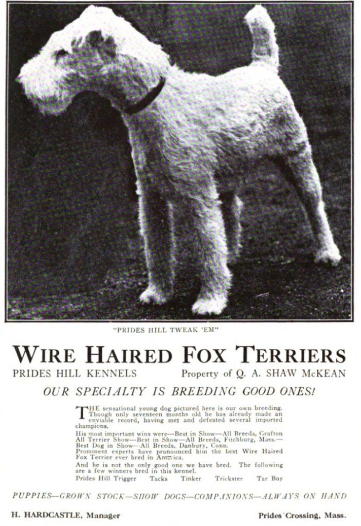 Photo and text: Birkdale. (1897, May 8). Mr. Chapman’s kennel. Country Life Illustrated, pp. 488-490.Country Life Illustrated, May 15, 1897Anon. (1897, May 22). Some notable dogs. Country Life Illustrated, pp. 544-546.Anon. (1897, May 29). Some ladies’ dogs. Country Life Illustrated, pp. 578-579.Cleveland, R. M. (1918, January). Concerning terriers and some other breeds. Vanity Fair, p. 63French bulldog Champion Gamin’s Rival Cleveland, R. M. (1918, January). Concerning terriers and some other breeds. Vanity Fair, p. 78Scottish terrier Champion Walescott Maister Wullie in Vanity Fair, February 1918Vanity Fair, February 1918Ch. Normanton Tippet, an airedale belonging to the Marbald kennel. Vanity Fair, March 1918Vanity Fair, March 1918Vanity Fair, March 1918Another photo of the wirehaired fox terrier pictured earlier in the post. Vanity Fair, December 1917